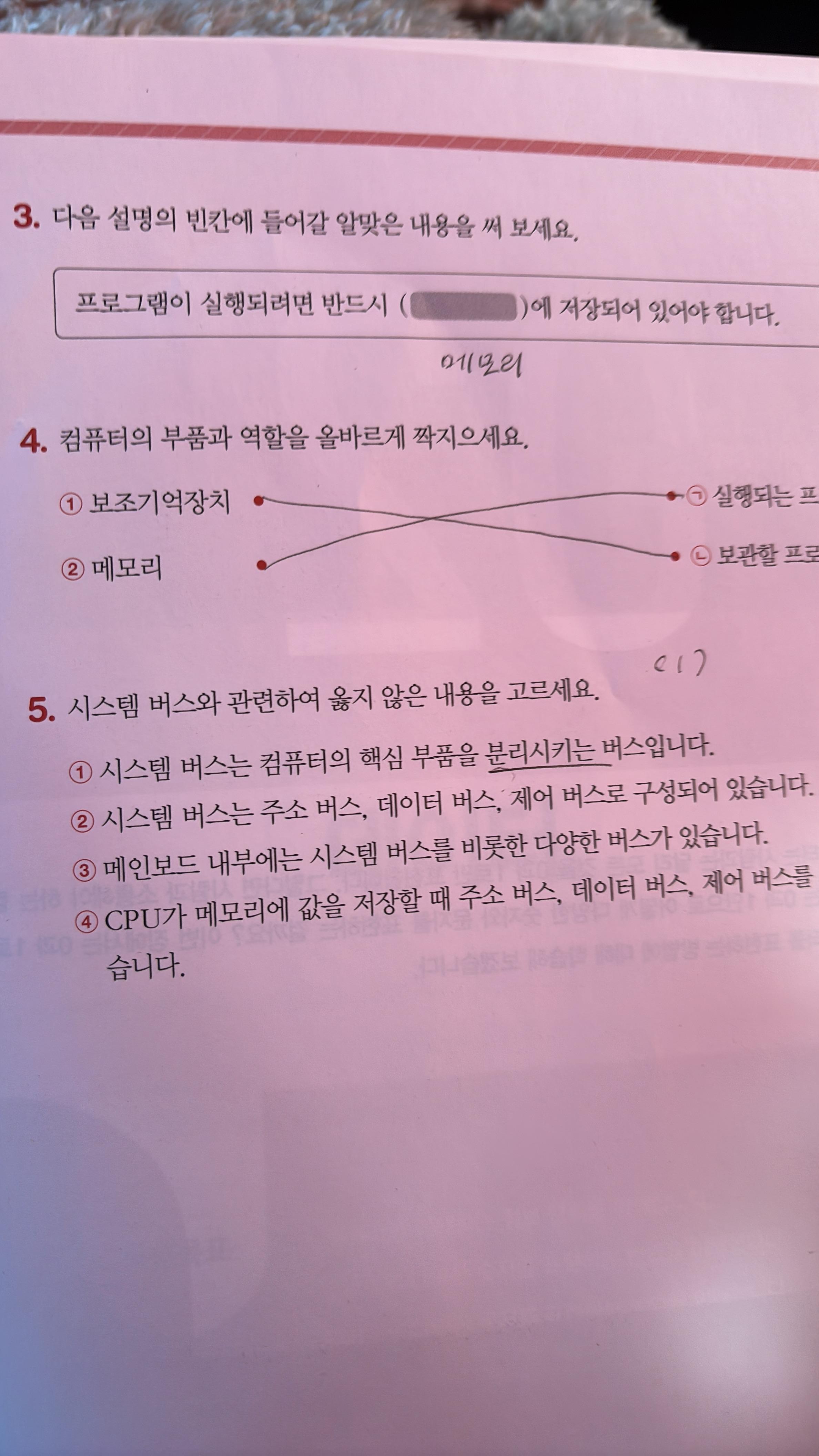 → 3 : 빈칸 채우기 - 프로그램이 실행되려면 반드시 “메모리”에 저장되어 있어야 한다.